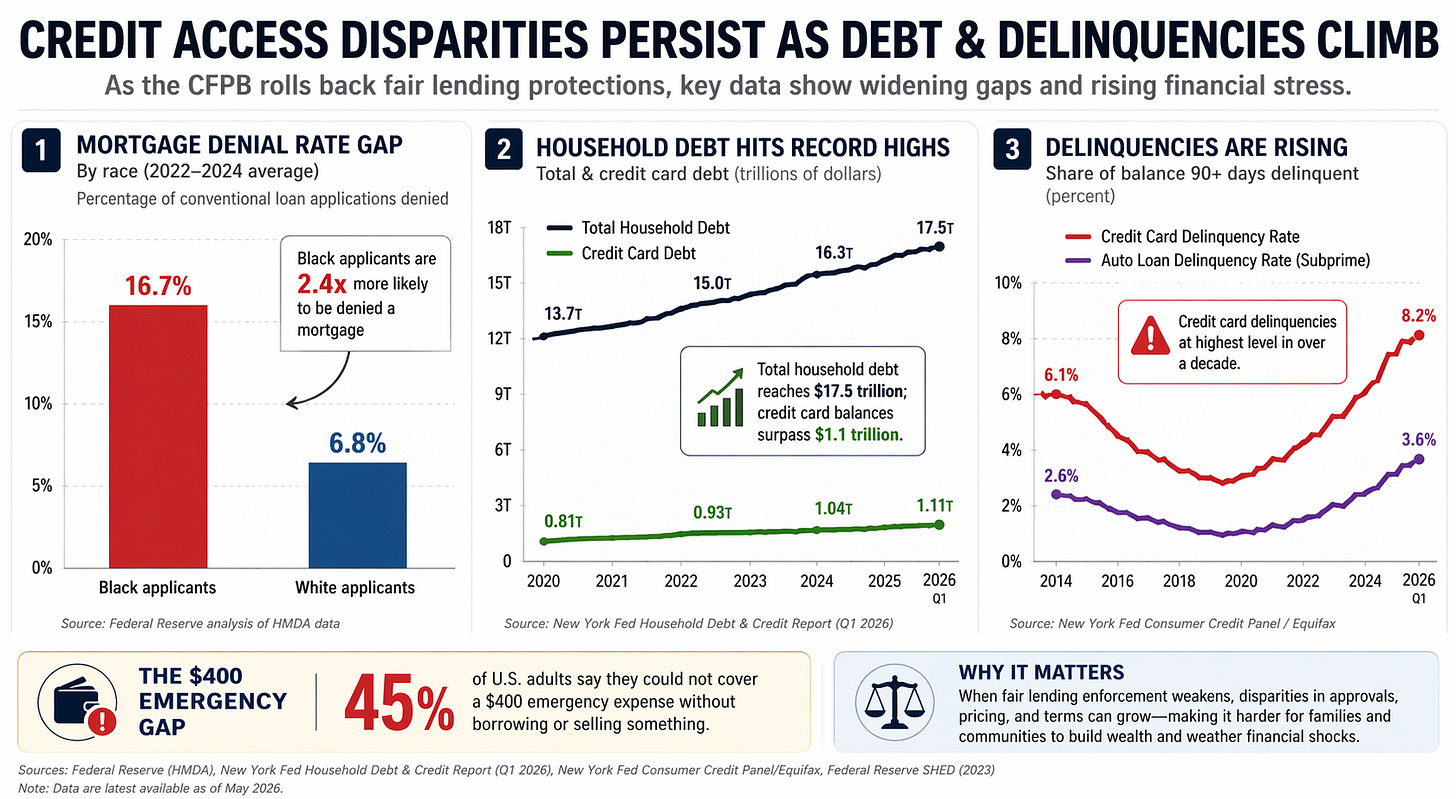 With borrowing costs elevated and household debt near record levels, access to fair and affordable credit is increasingly critical for consumers trying to:
