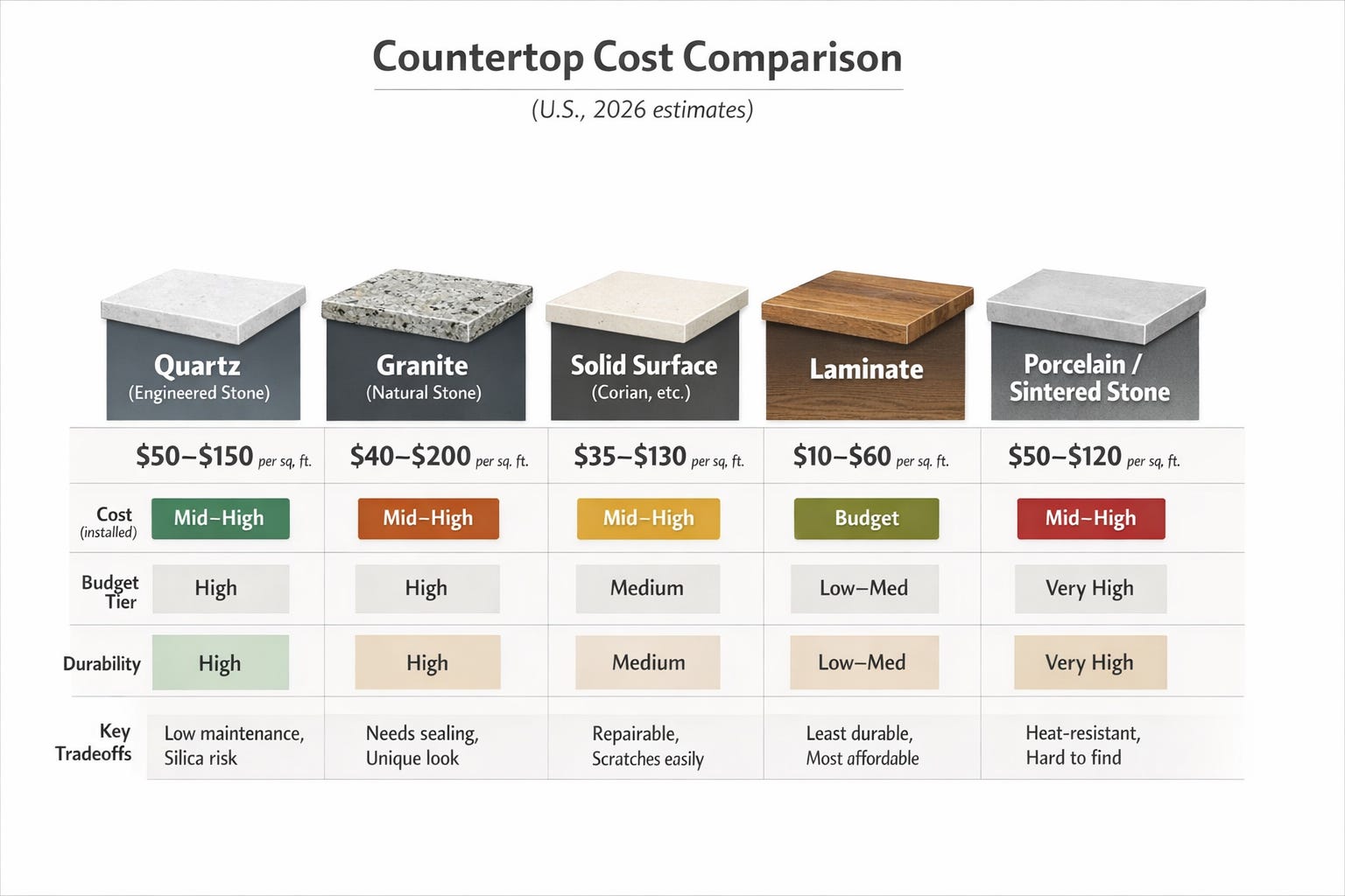 Cheapest option, but less durable and less desirable for resaleSolid surface (e.g., Corian)