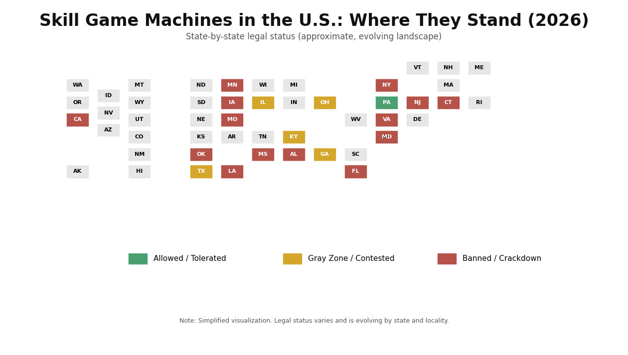 In many states, the devices have been operating in a gray market but a strong trend is developing to regulate them as illegal gambling devices. States actively working the issue include: