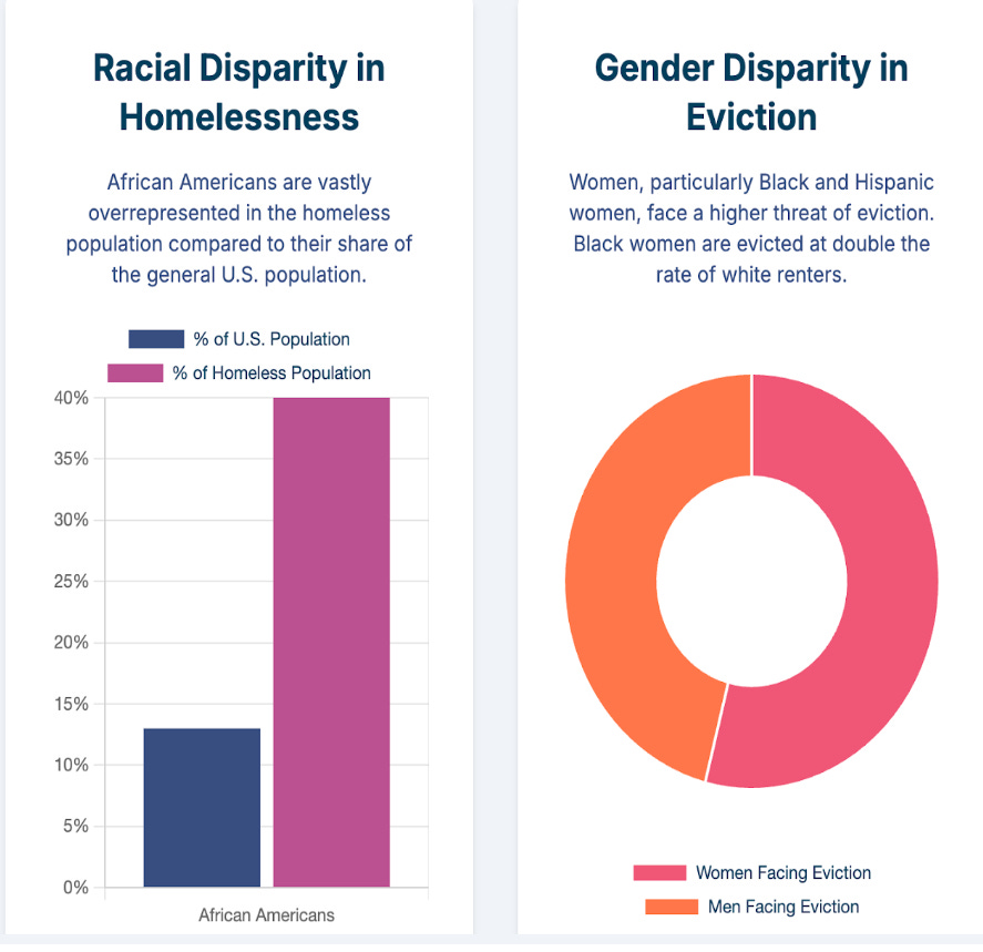 Eviction doesn’t hit everyone equally. Black women renters face eviction at twice the rate of white renters⁹. Black Americans make up just 13% of the U.S. population but 40% of all people experiencing homelessness¹⁰. These disparities are no accident—they’re the result of decades of discriminatory housing policy and zoning rules that keep communities of color in the most precarious positions.
