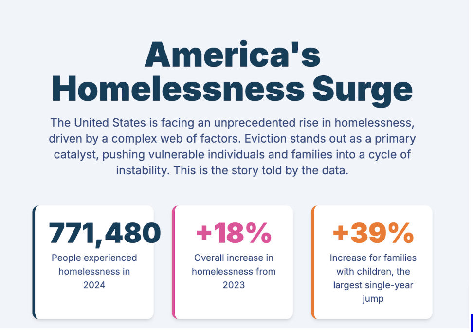 Homelessness in America has exploded. In 2024, 771,480 people were homeless on any given night—an 18% increase from the year before. Families with children saw the steepest rise: nearly 150,000 kids slept without a permanent home¹. The top driver? Eviction. And it’s not just a temporary setback—it’s a long-term life disrupter.