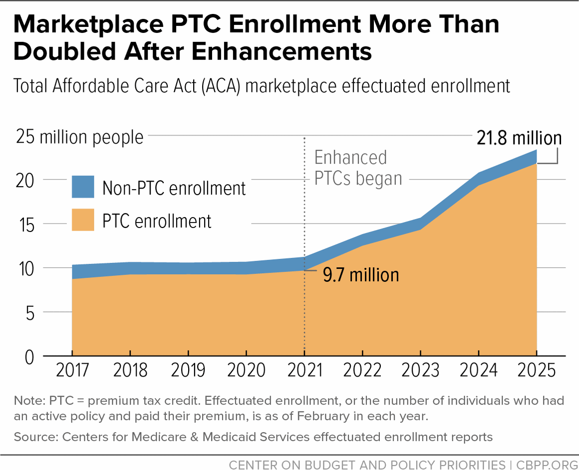 The enhanced credits helped drive ACA enrollment to record highs—23.4 million people as of February 2025, up from 11.2 million in 2021. Over 21 million of those enrollees received tax credits, more than double the pre-enhancement number.