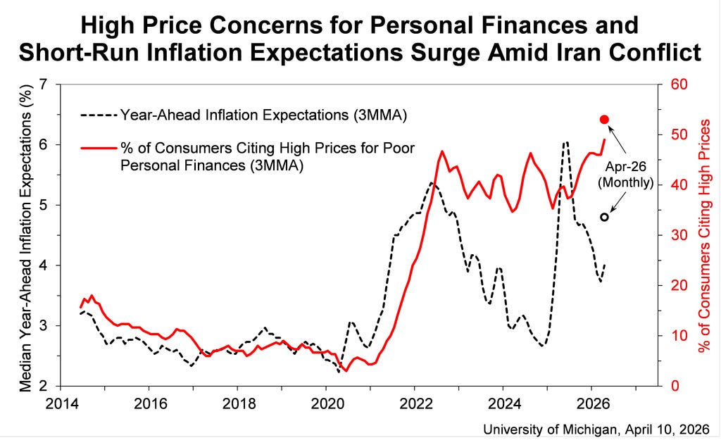 Inflation expectations also jumped, with consumers now anticipating 4.8% inflation over the next year — a full percentage point increase in just one month.