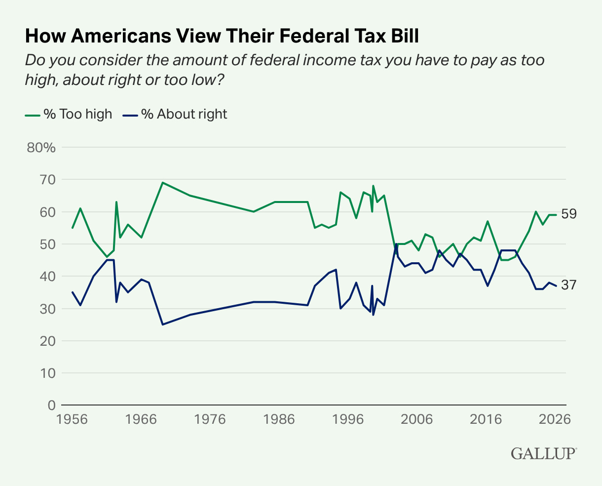 Gallup pollsters find that nearly six in 10 Americans say their taxes are too high.