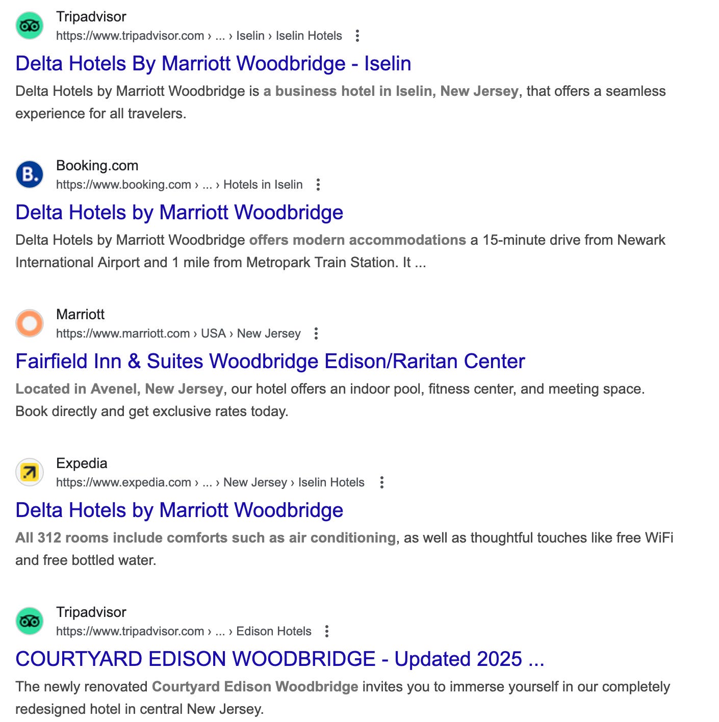 This is really infuriating a lot of the time. Say you want to find a Marriott in Woodbridge, New Jersey. You type “Marriott in Woodbridge, NJ” and get a pageful of links that look like they are straightforward information sources for and by Marriott, when in fact they are mostly ads for other hotels and, even worse, for booking agencies that pass themselves off as Marriott and get their hands on your dollars before Marriott does.