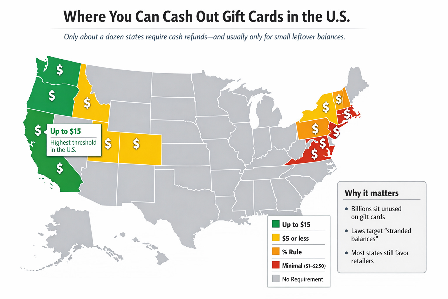 The central change under SB 22 is the increase in the cash-redemption threshold from $10 to $15. The bill also makes two related adjustments: It brings electronic gift cards within the scope of the statute, and it carves out an exception for gift certificates donated to nonprofits.