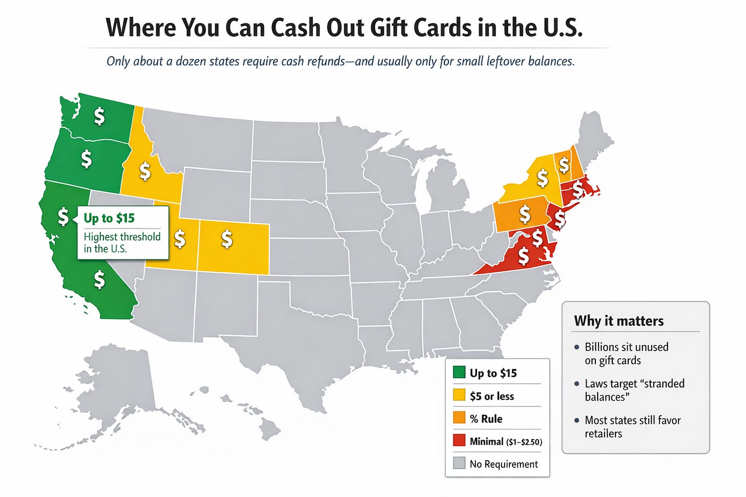 Most states don’t have any requirement that stores return unused balances — the technical term is “stranded value” — so if you’re a person who puts off using gift cards, California may be the place for you.