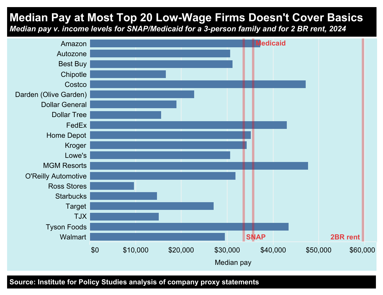 Median pay at most of these companies falls below Medicaid eligibility levels for a family of three in many states.