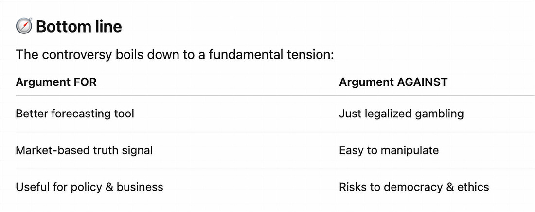 Supporters say prediction markets are valuable forecasting tools — claiming they aggregate crowd wisdom and often outperform polls or experts. Critics argue they are unregulated gambling, especially when tied to politics or public policy.