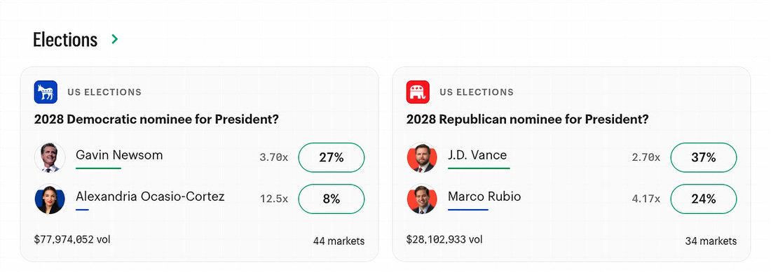 Kalshi’s two top-money markets today are the 2028 elections, with nearly $78 million being placed on the likely Democratic race and $28 million on the GOP match-up.