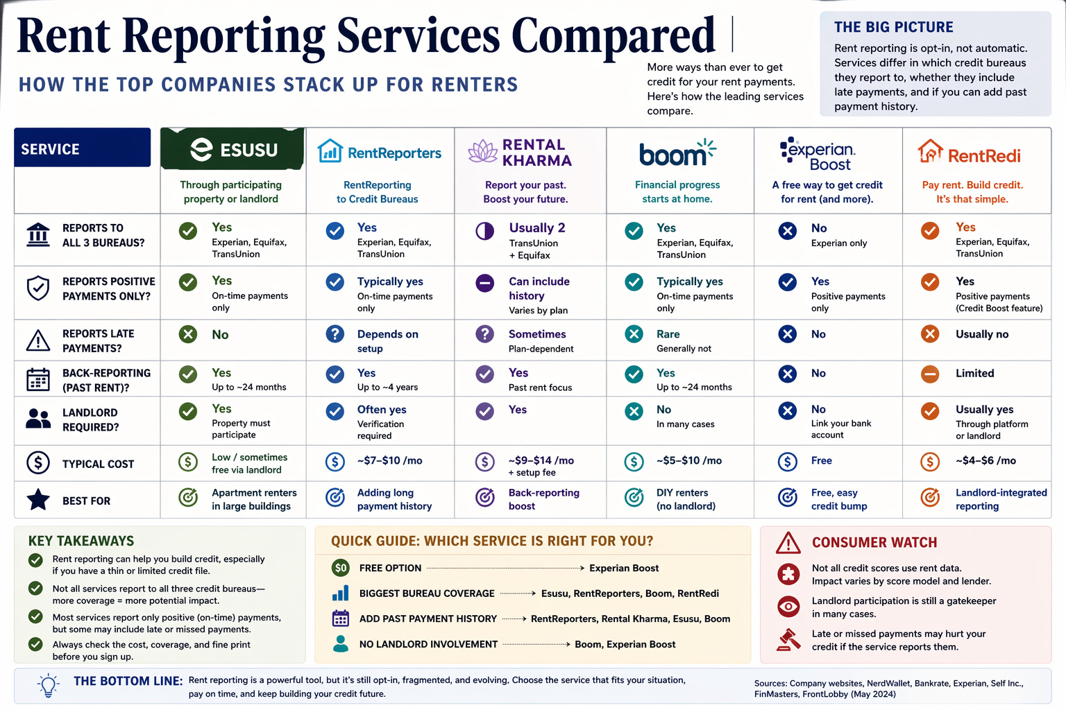 A handful of companies — especially Esusu, RentReporters, and Experian Boost — are shaping the market