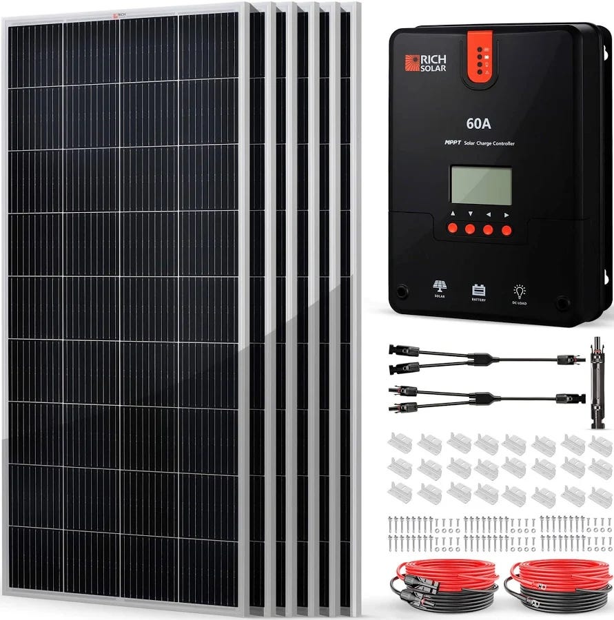 Rich Solar 1200W Solar Kit · $1,899.99 A solid 1.2 kW panel kit with MPPT controller you’d pair with batteries; good for powering lights and a fridge if sized right.