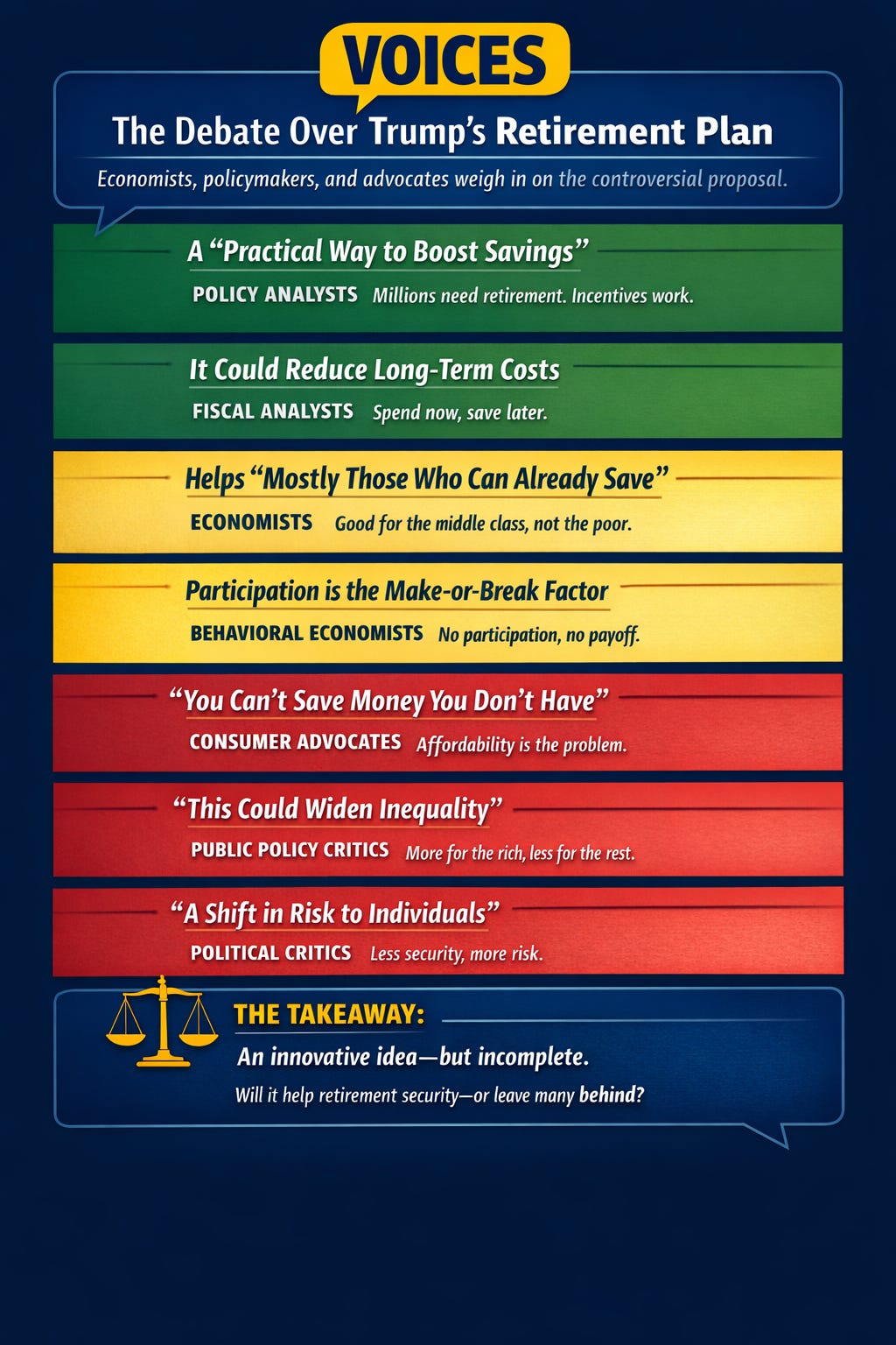 Supporters say the plan tackles a real gap: millions of workers lack access to retirement accounts. Matching contributions, they argue, is one of the most effective ways to encourage saving—especially when accounts are portable and easy to use.