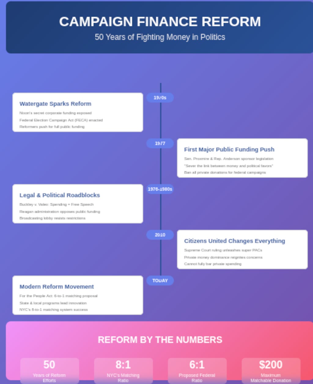 The idea isn't new. In the wake of the Watergate scandal, reformers in the 1970s and 1980s fought fiercely to eliminate private financing of campaigns altogether, believing only a fully public system could protect democracy from the corrosive influence of big money.